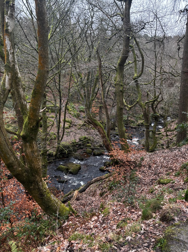 We kept moving to keep warm on the exposed paths and found ourselves travelling slightly back downhill across a wide open area with multiple paths carved and lots of gorse and similar shrubbery. I haven’t taken many photos during this part but would estimate we walked for a further 20-30 minutes before reaching another really pretty area where the brook was running through in much wider sections than we had seen before. This looked a great area for dogs to test the water! There are a couple of bridges across the brook that allow for good viewpoints and photographs.