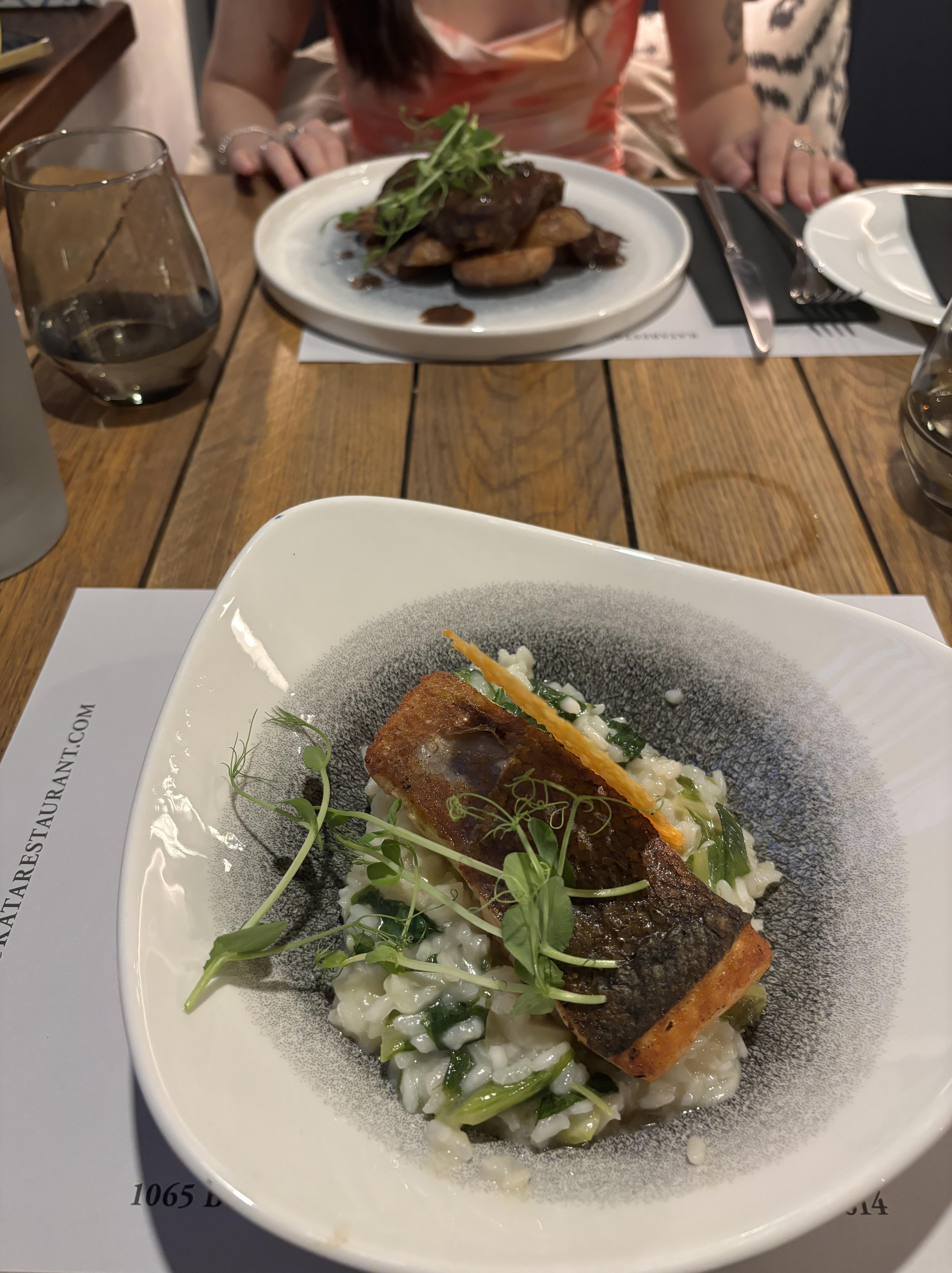 We always try and find a dedicated place everywhere we go and there are several in Budapest. This one is fairly new and on a lovely little tree lined street. We booked our table but the place was pretty much empty when we arrived so we could sit anywhere we liked. We had the Salmon and risotto and the steak with potatoes. Also a couple of very large limoncello spritz cocktails. Beautifully presented food. The menu changes regularly and is now completely different from when we visited- a good reason for a return visit!